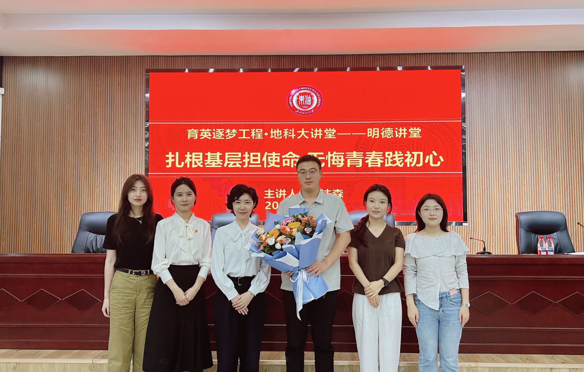 梁法森结合自身八年基层工作经历,围绕“职业选择”“基层奉献”和“成长感悟”三个方面展开分享。他回忆了自己毕业时也曾在多种就业方向中徘徊探索,但最终坚定选择了扎根基层的心路历程,同时也感谢母校的教育和引导,让他能够坚定理想信念,勇于走向党和人民最需要的地方。通过讲述驻村期间克服方言障碍、手绘民情地图、带领贫困户发展冷水鱼养殖等真实事迹,生动展现了他从青年学子到基层干部的蜕变,诠释了地科人脚踏实地、艰苦奋斗的优良品格。