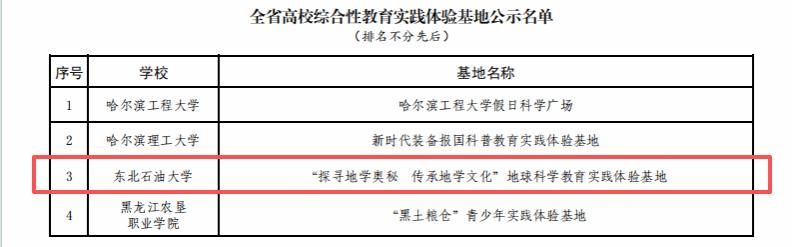 日前,黑龙江省教育厅公布“黑土铸魂”高校思想政治工作质量提升综合改革与精品建设项目入选名单,公司“探寻地学奥秘 传承地学文化”地球科学教育实践体验基地成功入选全省高校综合性教育实践体验基地。