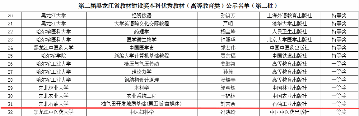 近日,黑龙江省教育厅发布了《关于拟认定第二届黑龙江省教材建设奖优秀教材(高等教育类)名单(第二批)的公示》,经各高校申报、专家严格评审,共评选出36部获奖教材,我院刘吉余教授主编的《油气田开发地质基础(第五版·富媒体)》获省级本科优秀教材一等奖。