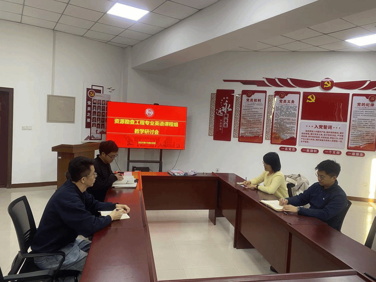 2025年10月28日,《资源勘查工程专业英语》课程教学团队在地科院610会议室举行教学研讨活动。课程组成员蒋飞、程丽娟、宋宪强、余博文参加,会议由蒋飞主持。